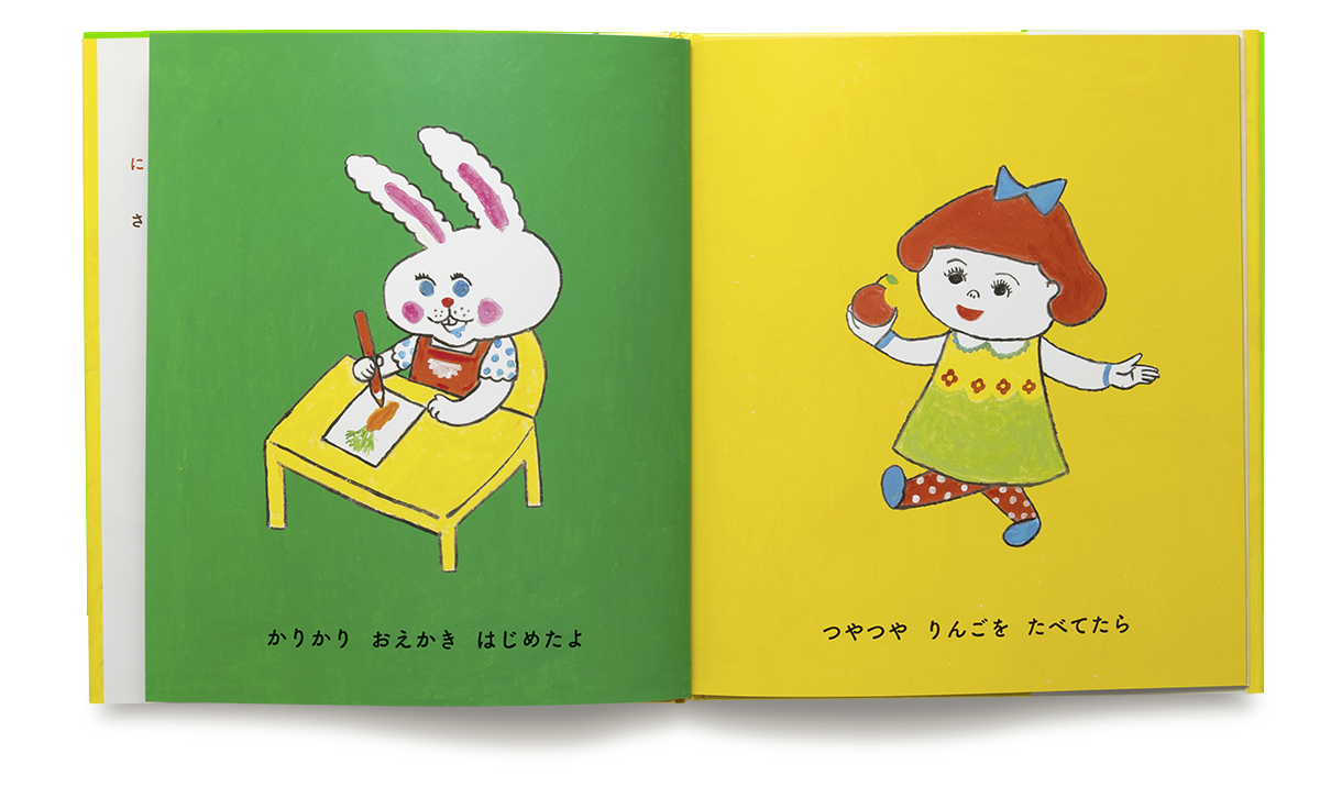 •かりかり: にんじんを「かりかり」食べる音から、鉛筆で「かりかり」お絵描きする音へ。