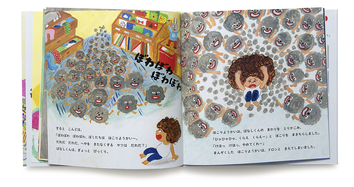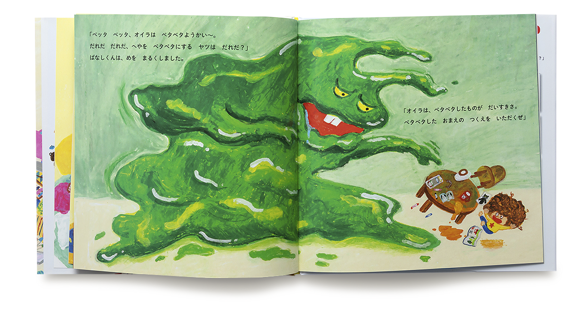 ぱなしくんの毎日は、朝、なかなかおきずにねっぱなし。朝ごはん、食べたうつわはおきっぱなし。毎日同じ服、きっぱなし。ぱなしくんのお母さんには、「こんなにちらかしていると、ごっちゃおばけがやってくるわよ」と、言われてしまいます。