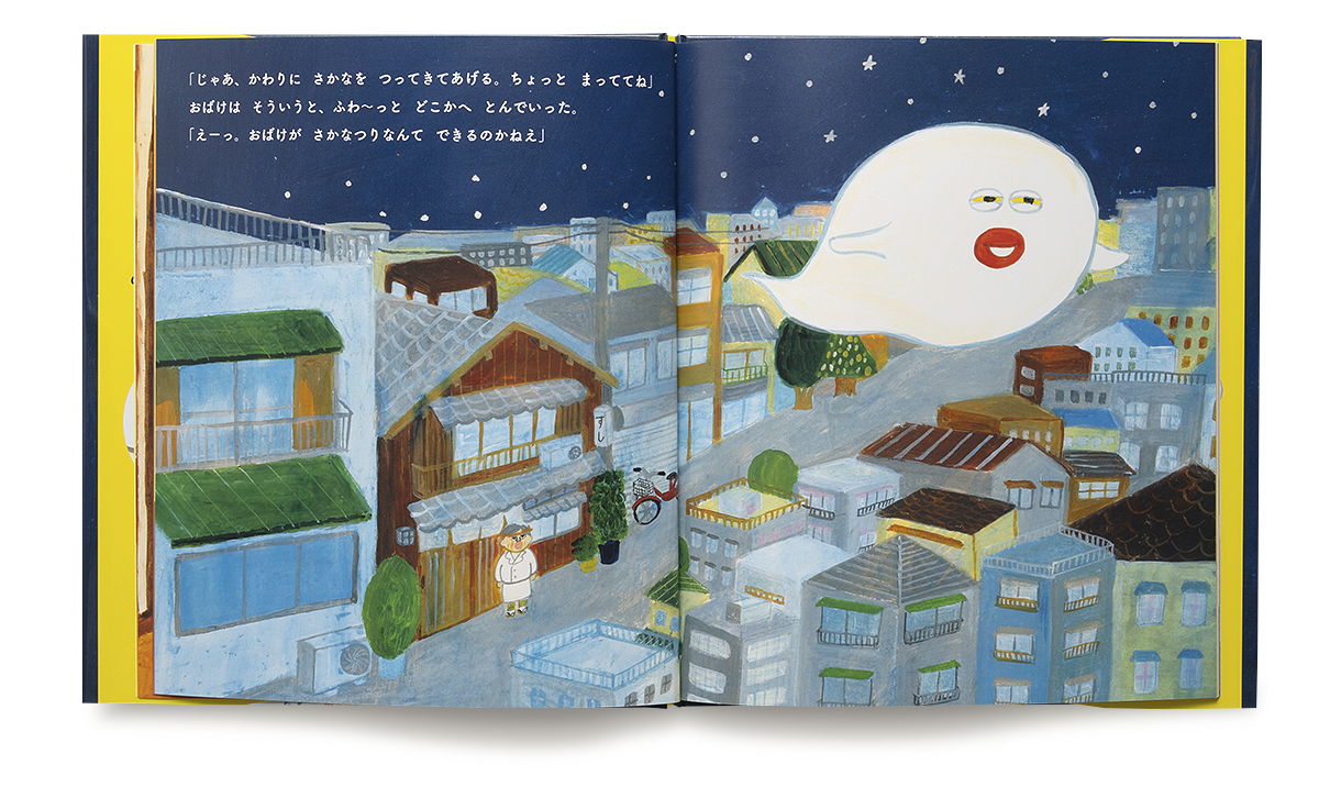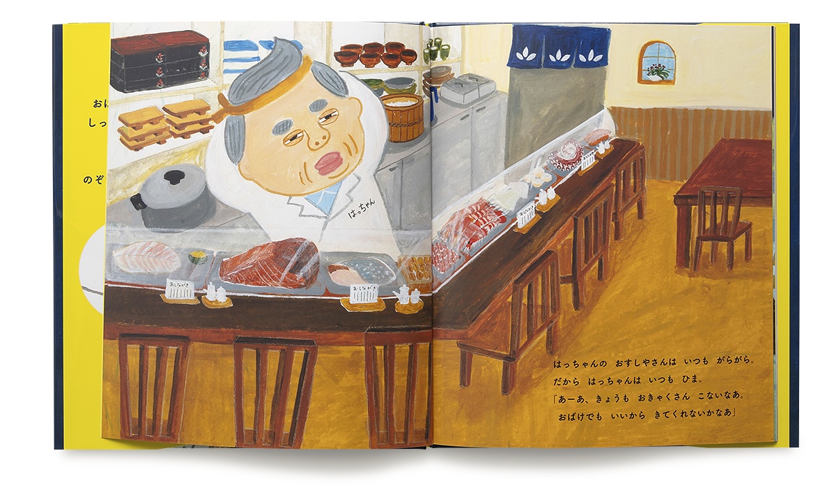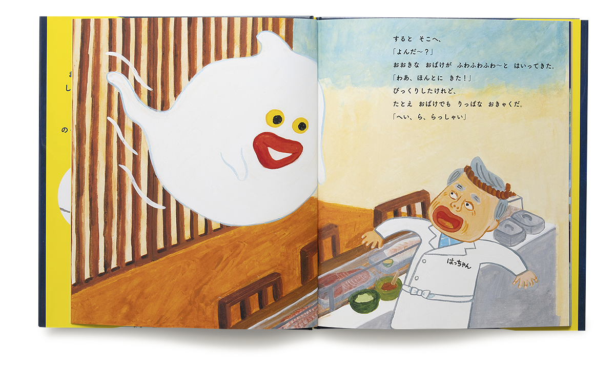 おばけでもいいから来てくれないかなあと、ひまなお寿司屋さんがつぶやくと本当におばけがやって来た! おばけにお寿司を握ってあげると、おばけは大喜び。お礼におばけの魚を釣ってきたけど、食べられるのかなあ?