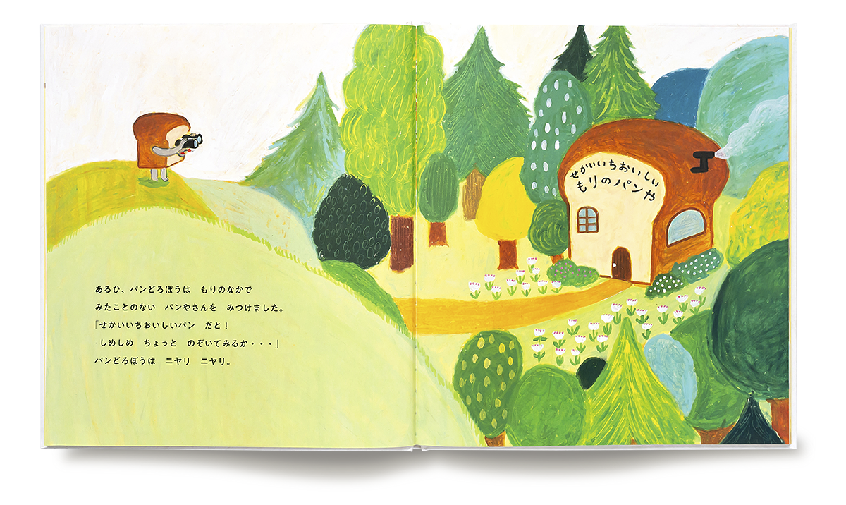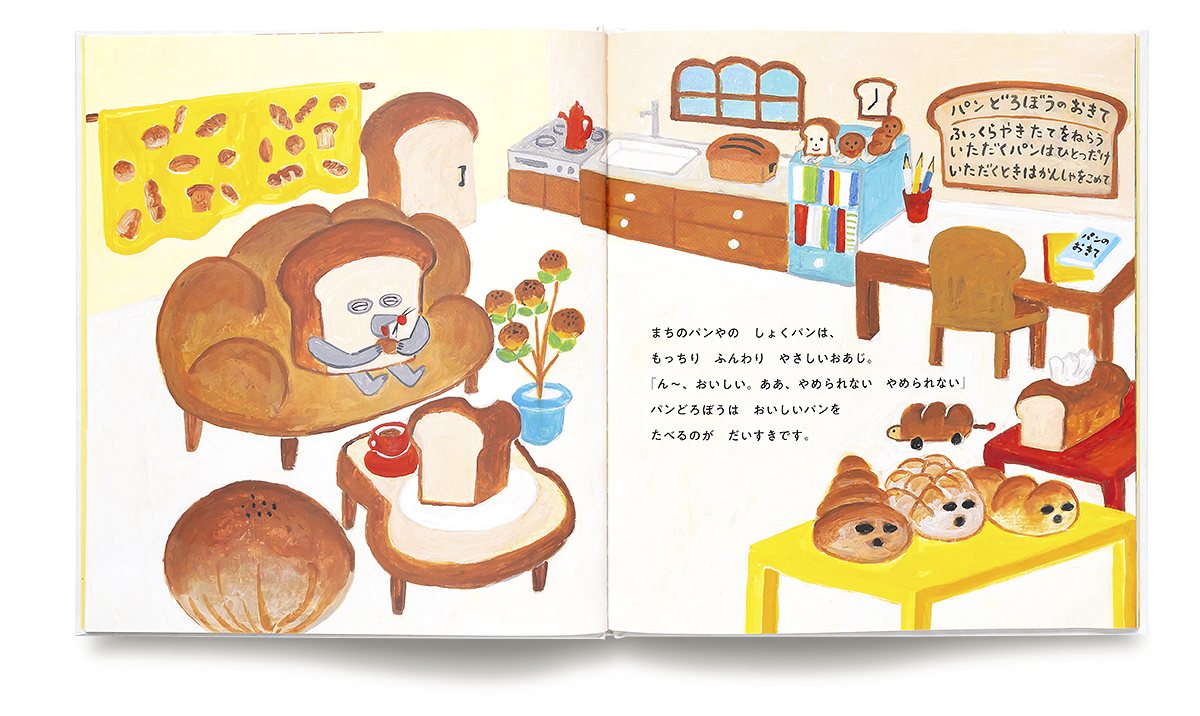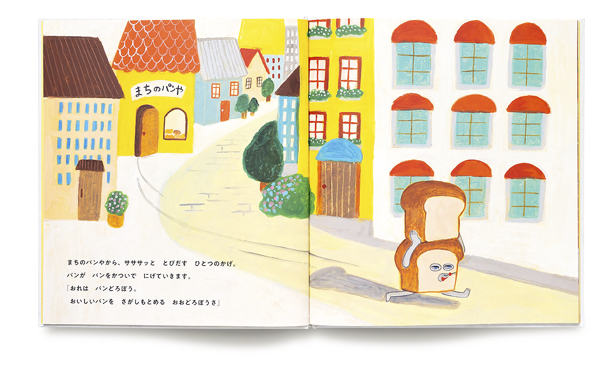 「おれは パンどろぼう。おいしいパンを さがしもとめる おおどろぼうさ」