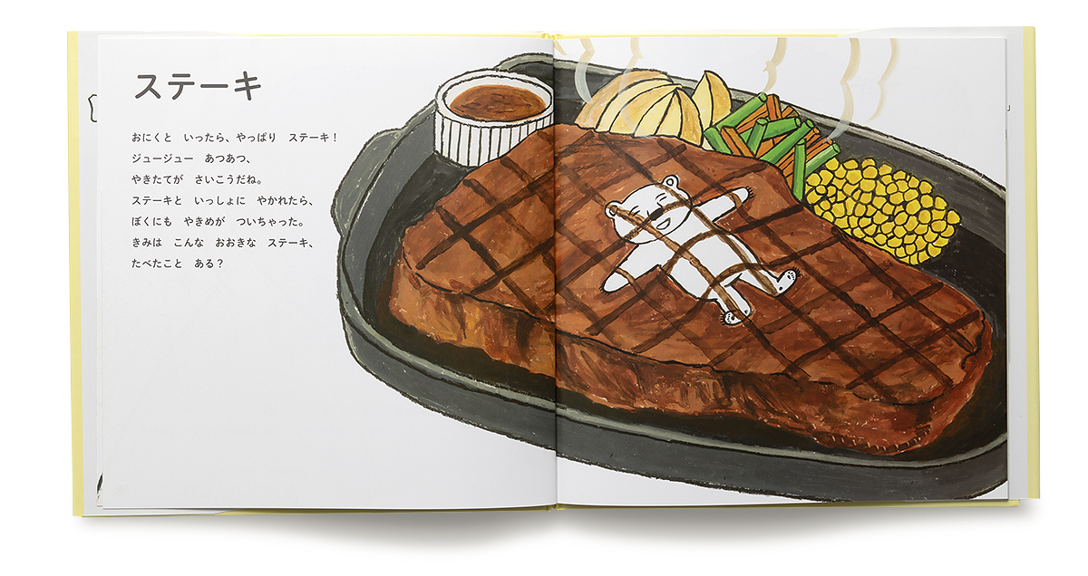「ステーキ」おにくといったら、やっぱりステーキ! ジュージューあつあつ、やきたてがさいこうだね。ステーキといっしょにやかれたら、ぼくにもやきめがついちゃった。
